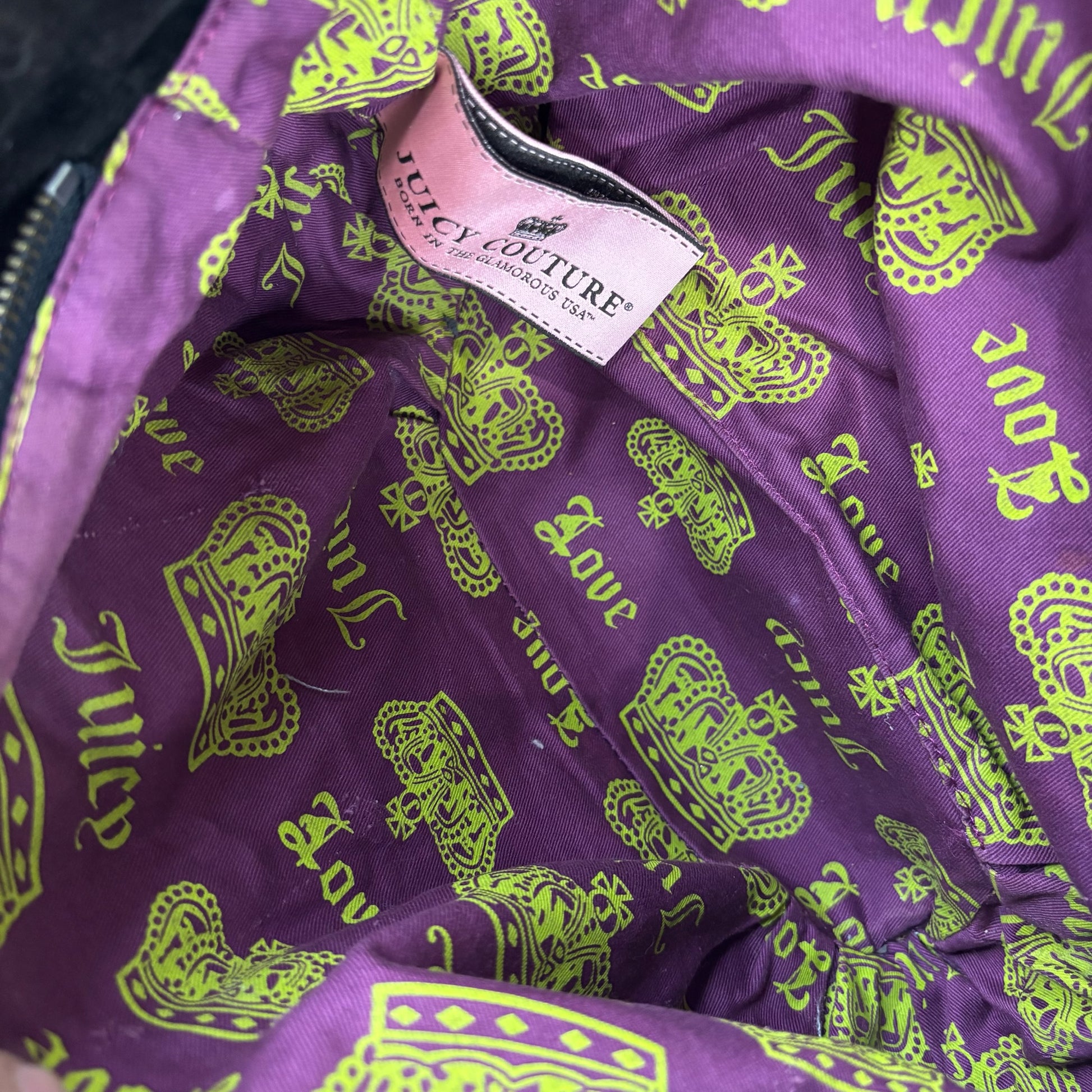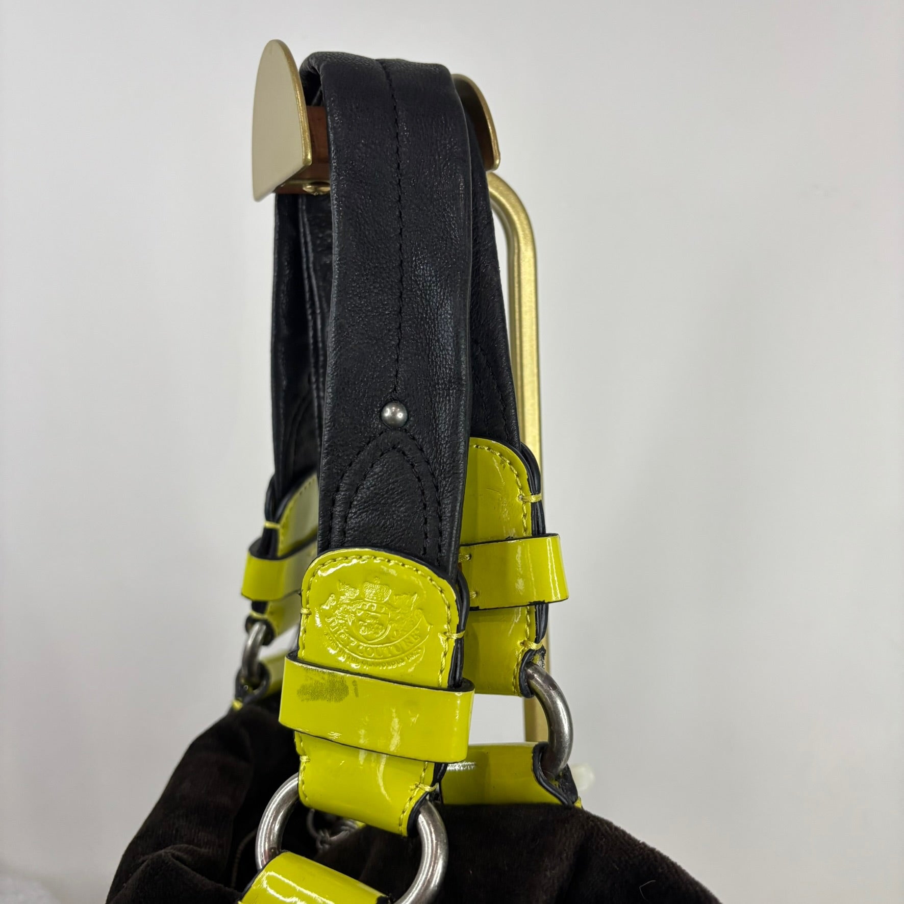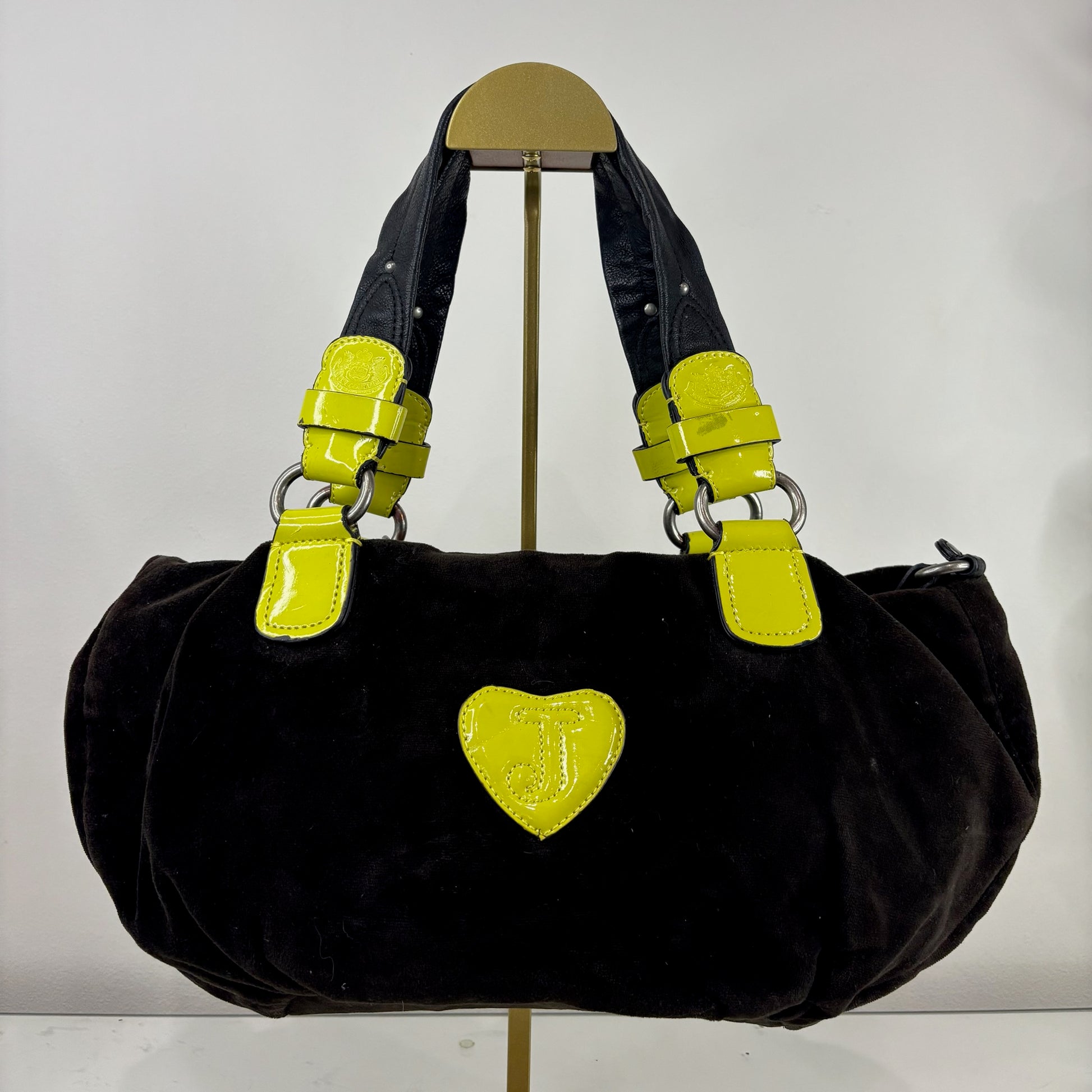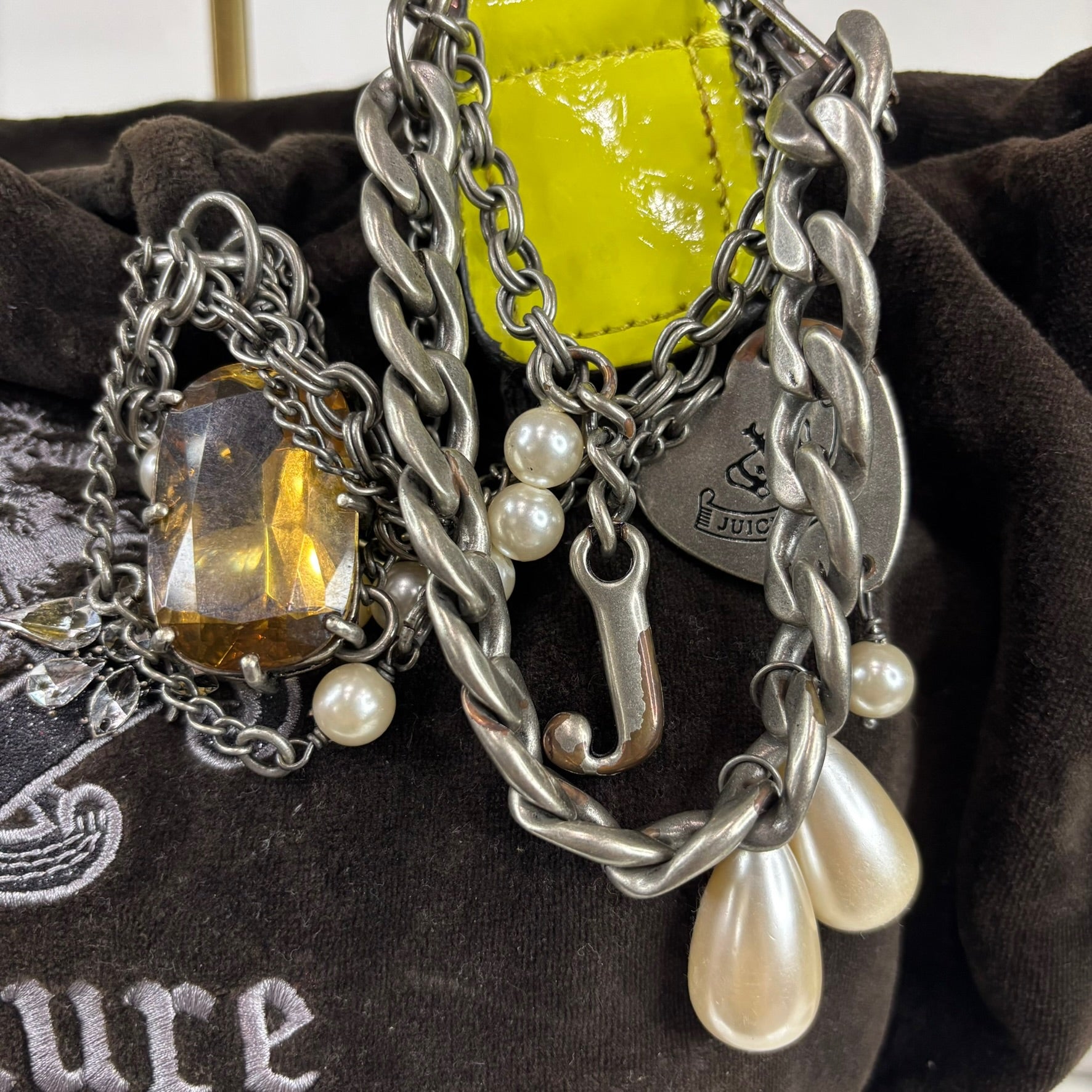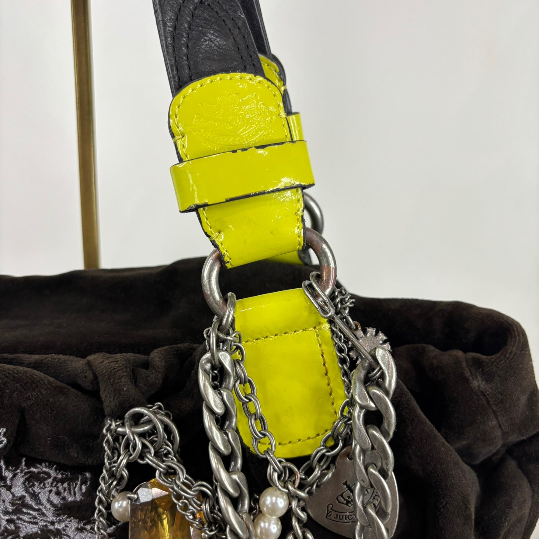 Vintage Juicy Couture Y2K brown velvet shoulder bag with neon yellow accents. Features chain, pearl, and jewel details, top zip closure, inner zip pocket, and original heart mirror. Faux silver trim shows some peeling.